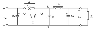 開關穩壓電源電路如圖2所示。圖2中的開關K以一定的時間間隔重復地接通和斷開,在K接通時,輸入電源Vin通過K和濾波電路供電給負載RL,當K斷開時,輸入電源Vin便中斷了能量的提供??梢?,輸入電源向負載提供能量是斷續的,為使負載能得到連續的能量提供,開關穩壓電源必須要有一套儲能裝置,在開關接通時將一部份能量儲存起來,在開關斷開時,向負載釋放。圖2中,由儲能電感L、濾波電容C2和續流二極管D組成的電路,就具有這種功能。在AB間的電壓平均值VAB可用式(1)表示。