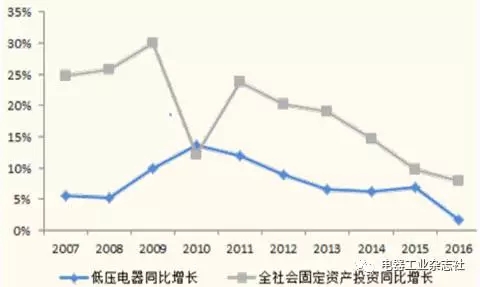 低壓電器市場(chǎng)規(guī)模增長和全社會(huì)固定資產(chǎn)投資增長對(duì)比