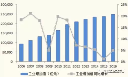 2006年到2016年中國工業(yè)增加值變化