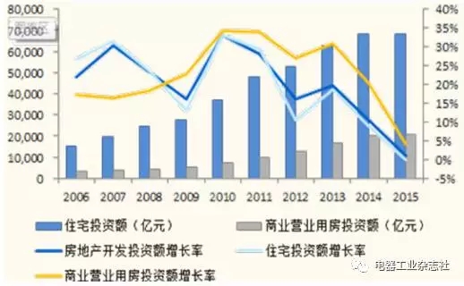 地產(chǎn)行業(yè)是終端電器和配電電器集中使用的行業(yè),中國房地產(chǎn)投資主要包括住宅投資和辦公樓及商業(yè)營業(yè)用房投資兩個(gè)部分,在過去的20年內(nèi),我國房地產(chǎn)行業(yè)迎來了一波高速發(fā)展。2006年到2015年十年間我國房地產(chǎn)年投資額從1.9萬億增加至9.6萬億,年均增幅高達(dá)19.4%,可謂開創(chuàng)了一個(gè)房地產(chǎn)發(fā)展奇跡。