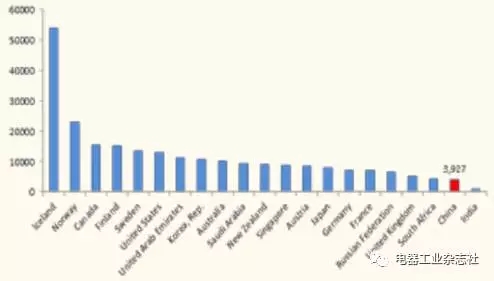 2014年中國和部分國家人均用電量對(duì)比