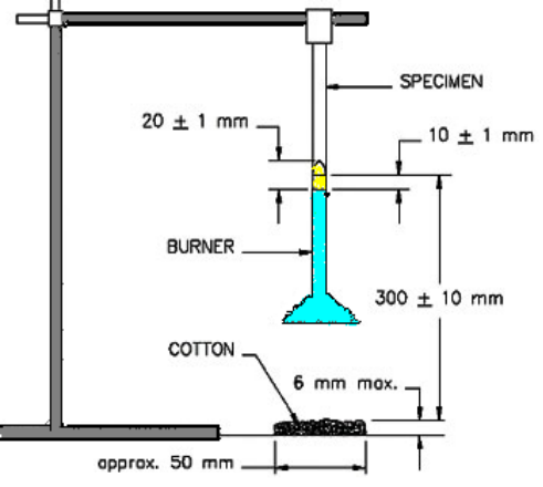 垂直燃燒是指以上端被夾持的規定尺寸和形狀的棒狀試樣處于垂直位置且自由端暴露在規定氣體火焰上的方式,測定試樣有焰燃燒和無焰燃燒的時間及燃燒狀態的試驗方法。